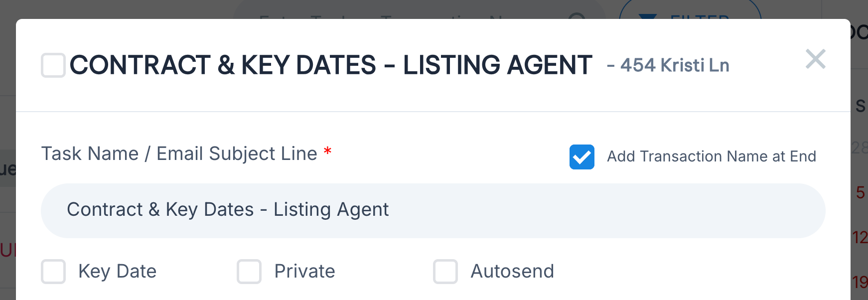 Before this update, every Email Task sent automatically had the name of the transaction at the end. When following up after closing, this made any automated outreach feel less personal.