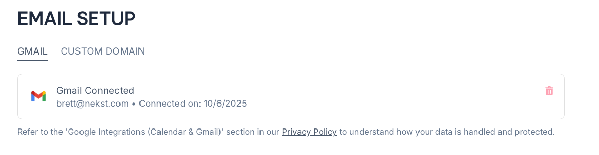 If you currently use Gmail or use Google Workspace where you host your own domain, you can integrate your Nekst account with Gmail to send Email directly from Nekst to any recipient from your personal email.